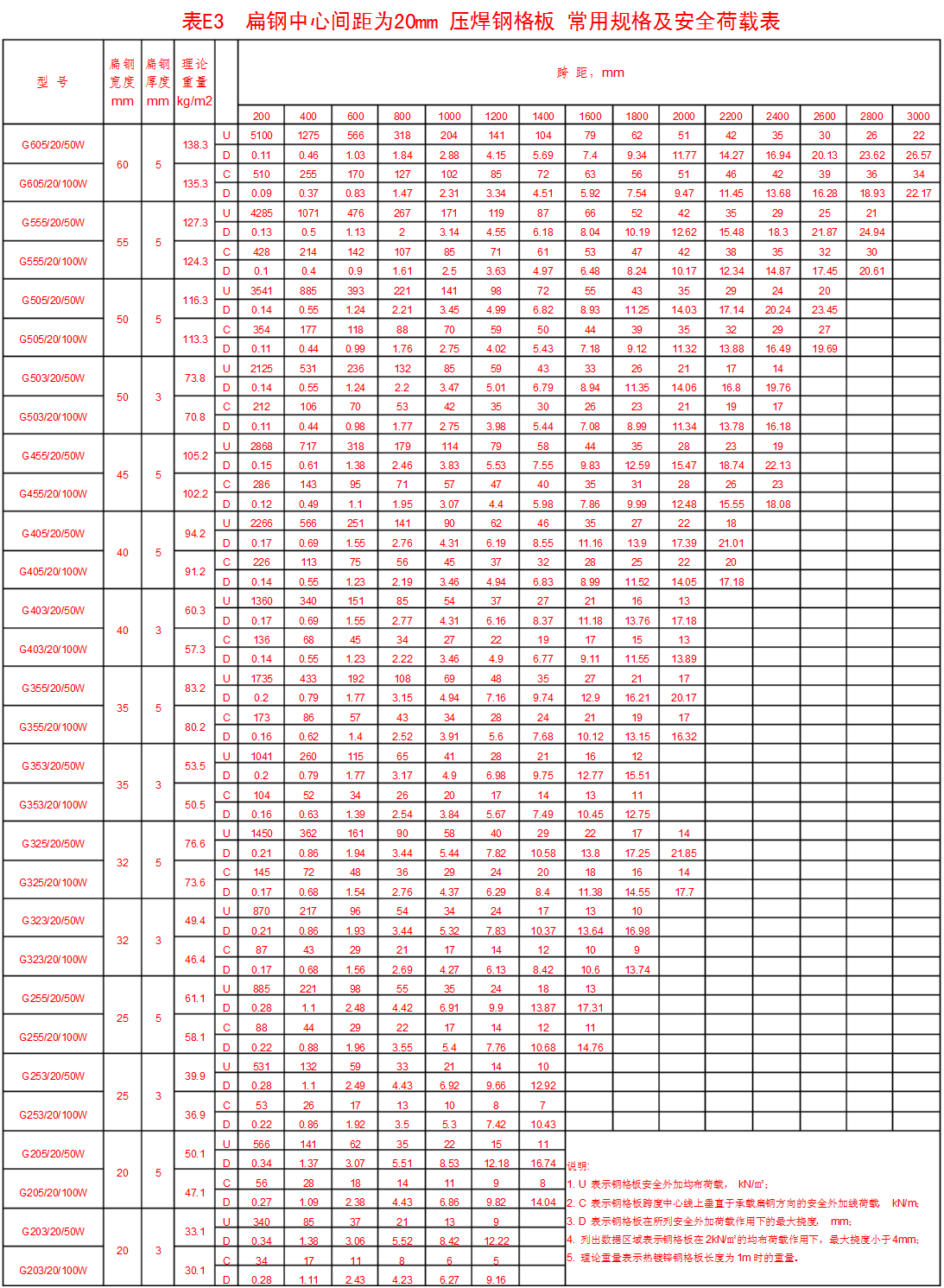 附錄表E.3 承載扁鋼,中心間距為20mm壓焊鋼格板。