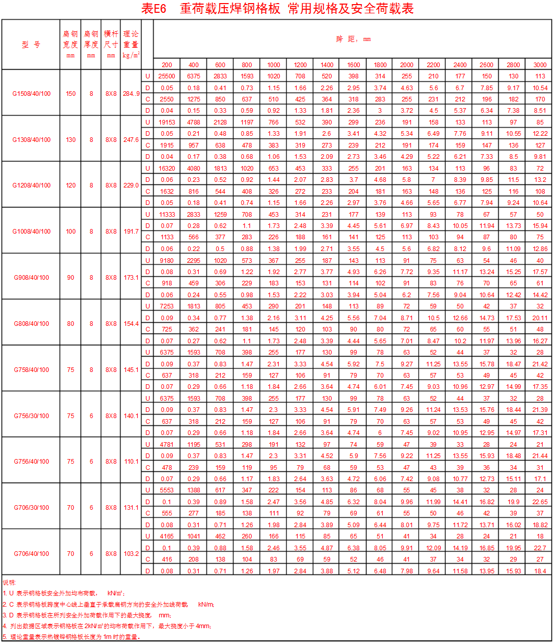 本附錄的安全荷載表為設計人員查詢鋼格板的荷載性能提供了方便,表中列了一些常用鋼格板的型號,在某一凈跨距時,安全荷載與撓度的對應關系,跨距從 200mm 到 3000mm,以 200mm 遞增。荷載表的數值計算基于靜止荷載的材料強度設計值(對于碳素結構鋼,強度設計值取 170×103  KN/ m 2 ),包括考慮了鋼格板的重量。當設計用于交通道路上的鋼格板時,還應考慮沖擊和疲勞的因素。荷載表的數值計算根據承載扁鋼的公稱尺寸進行,如果承載扁鋼是負公差,應當考慮一個折減系數。同樣,承載扁鋼由于沖齒開孔開槽等造成截面尺寸的變化,都應當考慮折減。壓鎖鋼格板的安全荷載表由生產廠商提供。所有荷載性能的計算僅考慮承載扁鋼的貢獻而忽略橫桿。荷載表列出數據的區域,表示該型號鋼格板在 2kN/㎡均布荷載作用下,最大撓度小于 4 ㎜。對于表中未列出型號的鋼格板或有特殊要求的場合使用的鋼格板,由供需雙方根據本部分的有關規定生產供應。