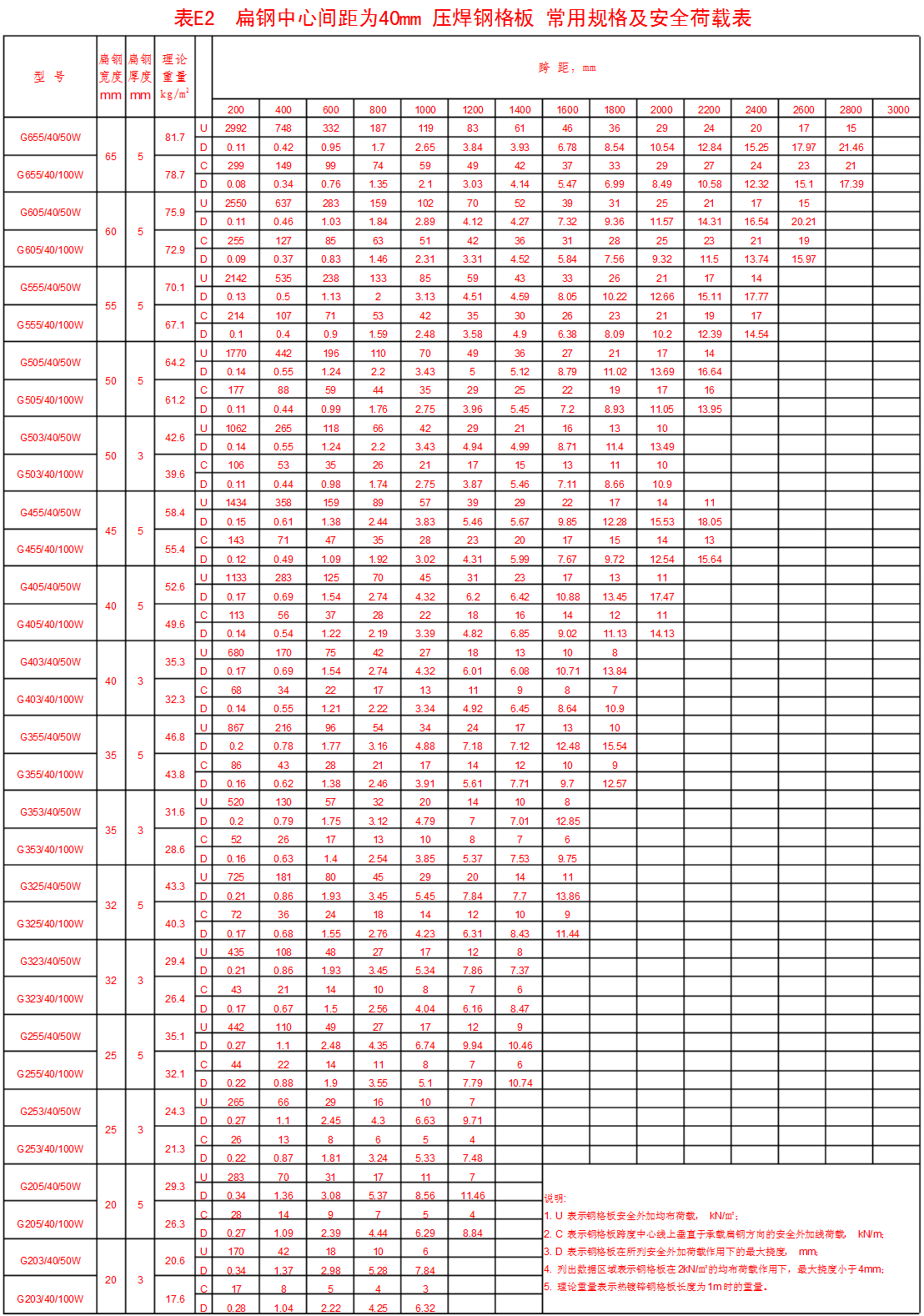 附錄表E.2 承載扁鋼,中心間距為40mm壓焊鋼格板。